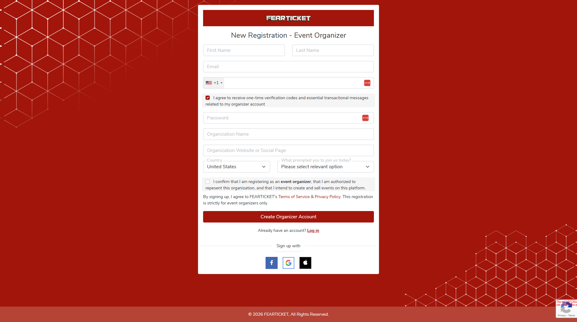 Review and accept FEARTICKET’s Terms of Service & Privacy Policy. This registration is strictly for event organizers only.