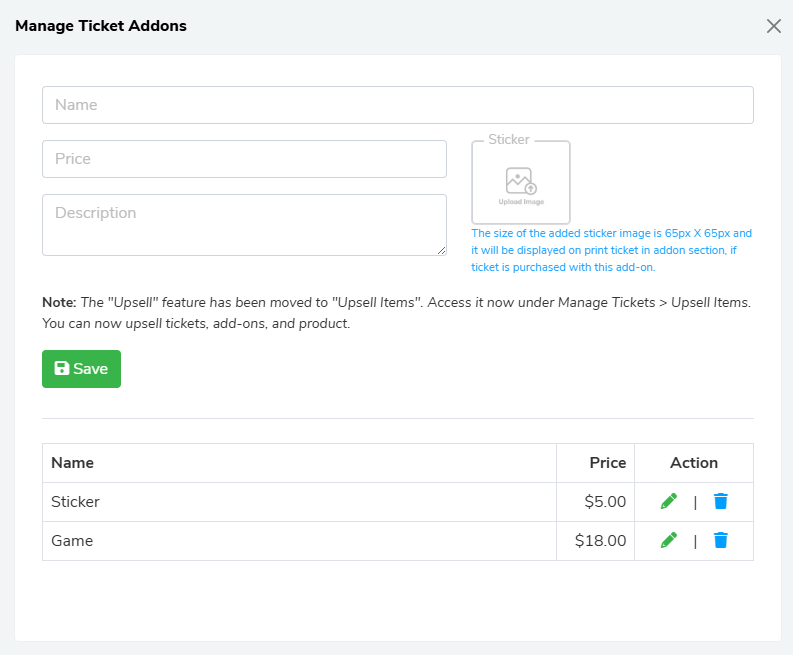 2. On the "Manage Ticket" page, click on the "ADD TICKET ADDON" button to open a new window.