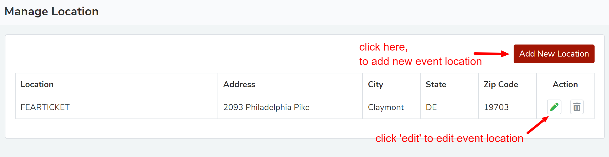 If need to edit venue info, on the right see the “ACTION” column and click on “(Edit Icon)” to go into edit mode for an event venue.
