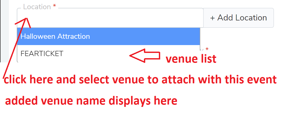 To add the event location, simply click on the 'Location' field, which is illustrated in the image below. and select the address of the event that you have added from the manage location page.
