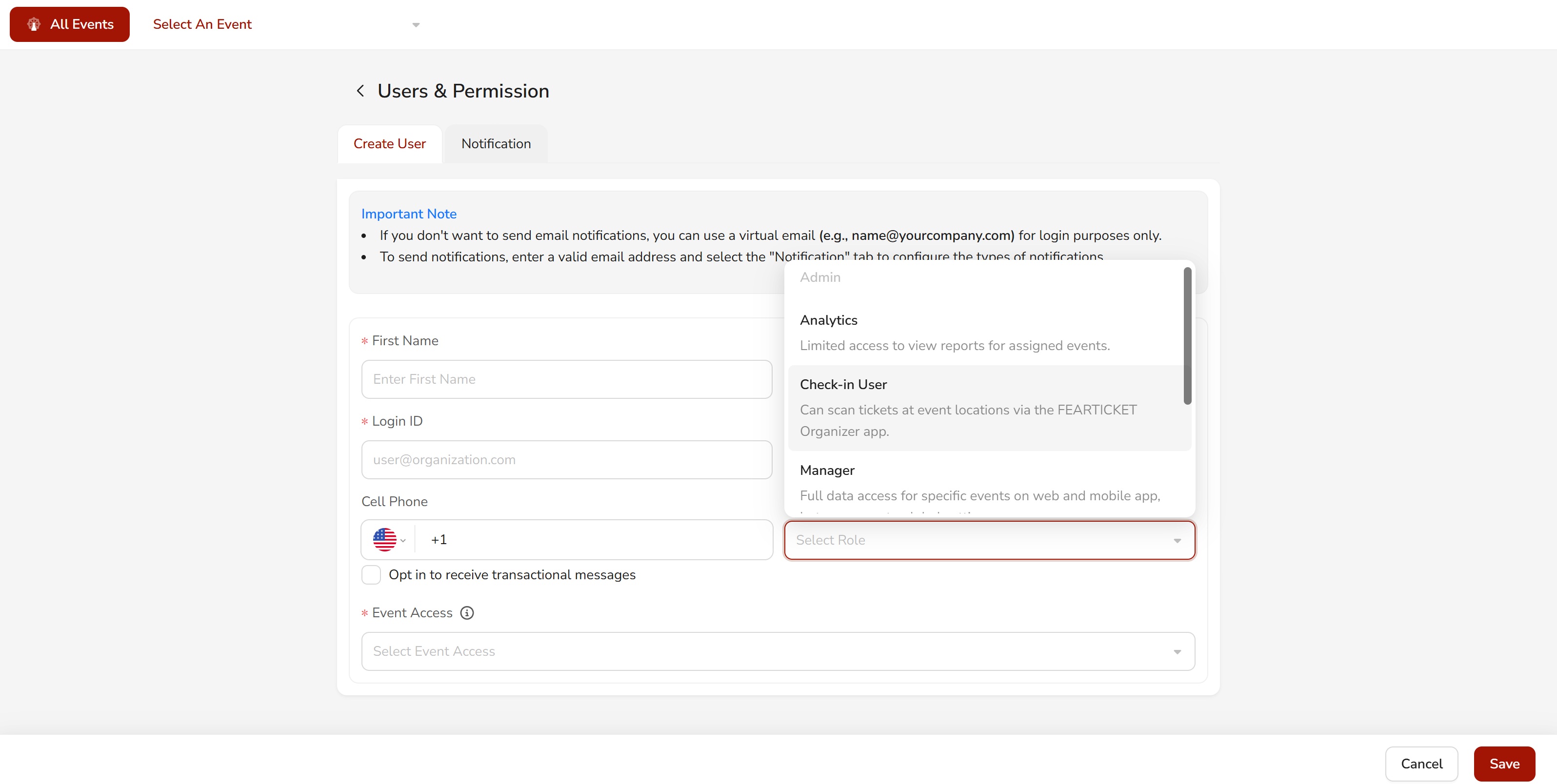 Users with an Admin Role can create additional system users like Check-in (App Only) User, Box-Office (POS) User, Event Manager, Marketing, and Analytics.