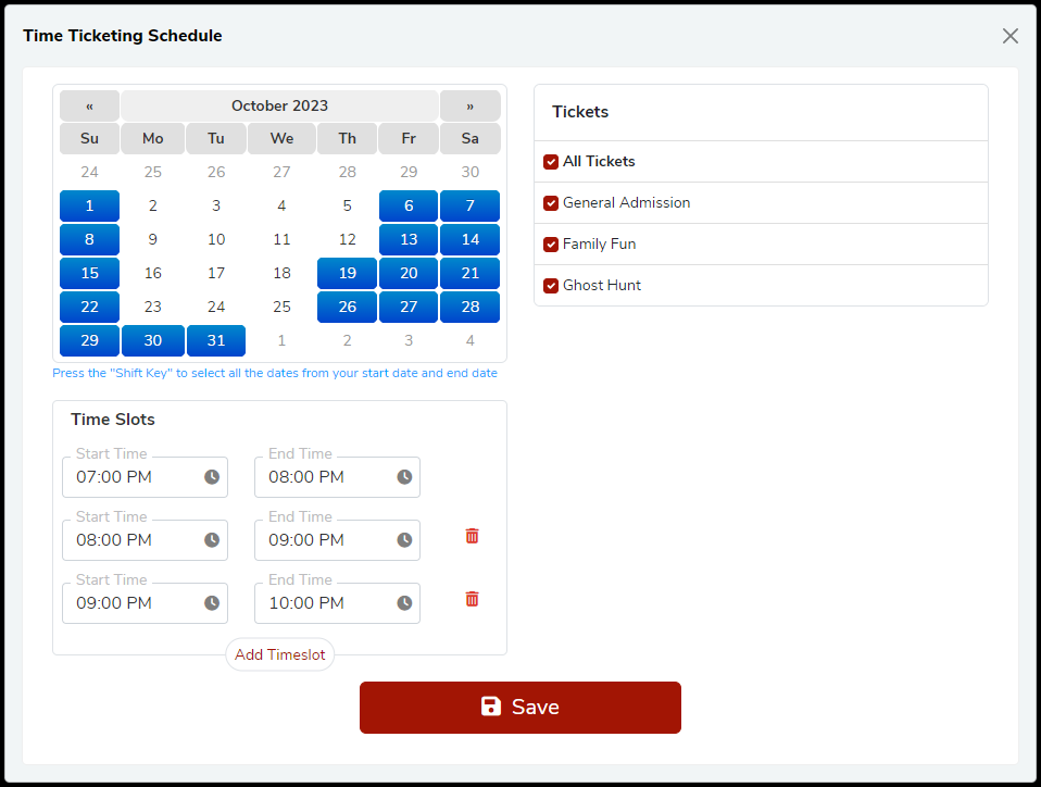 This type of schedule is good for the event which has the specific operational hour slots for specific dates in the event schedule. It means the event starts at 07:00 pm on specific dates of event schedule. So it will be like 07:00 pm to 08:00 pm, 08:00 pm to 09:00 pm, and so on for every weekends of Halloween month.