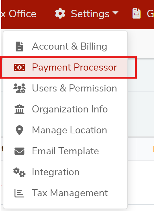 Click on "Payment Processor" from the top "Settings" menu located on the top right as shown in the below screenshot.