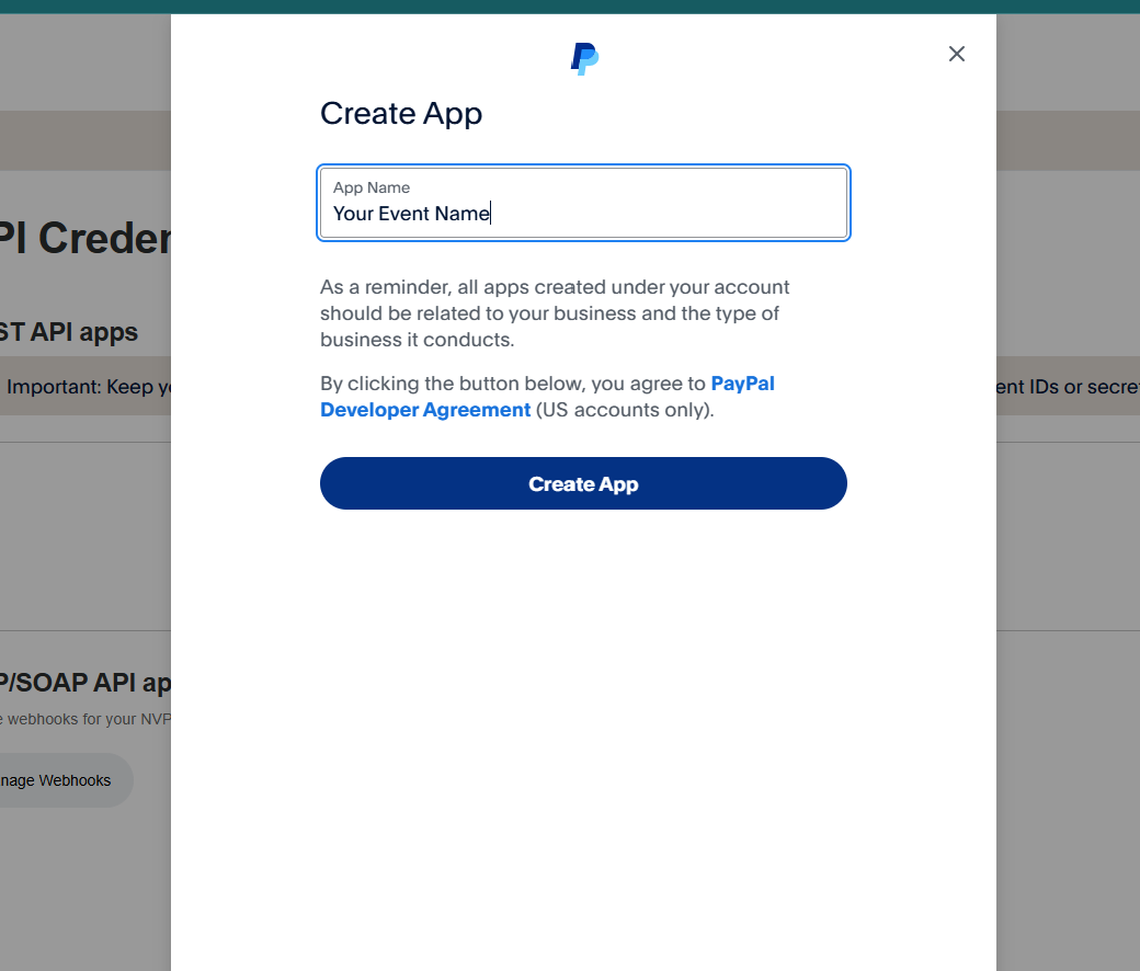 Write your company/ event name under the "App Name" field and click on "Create App" button.