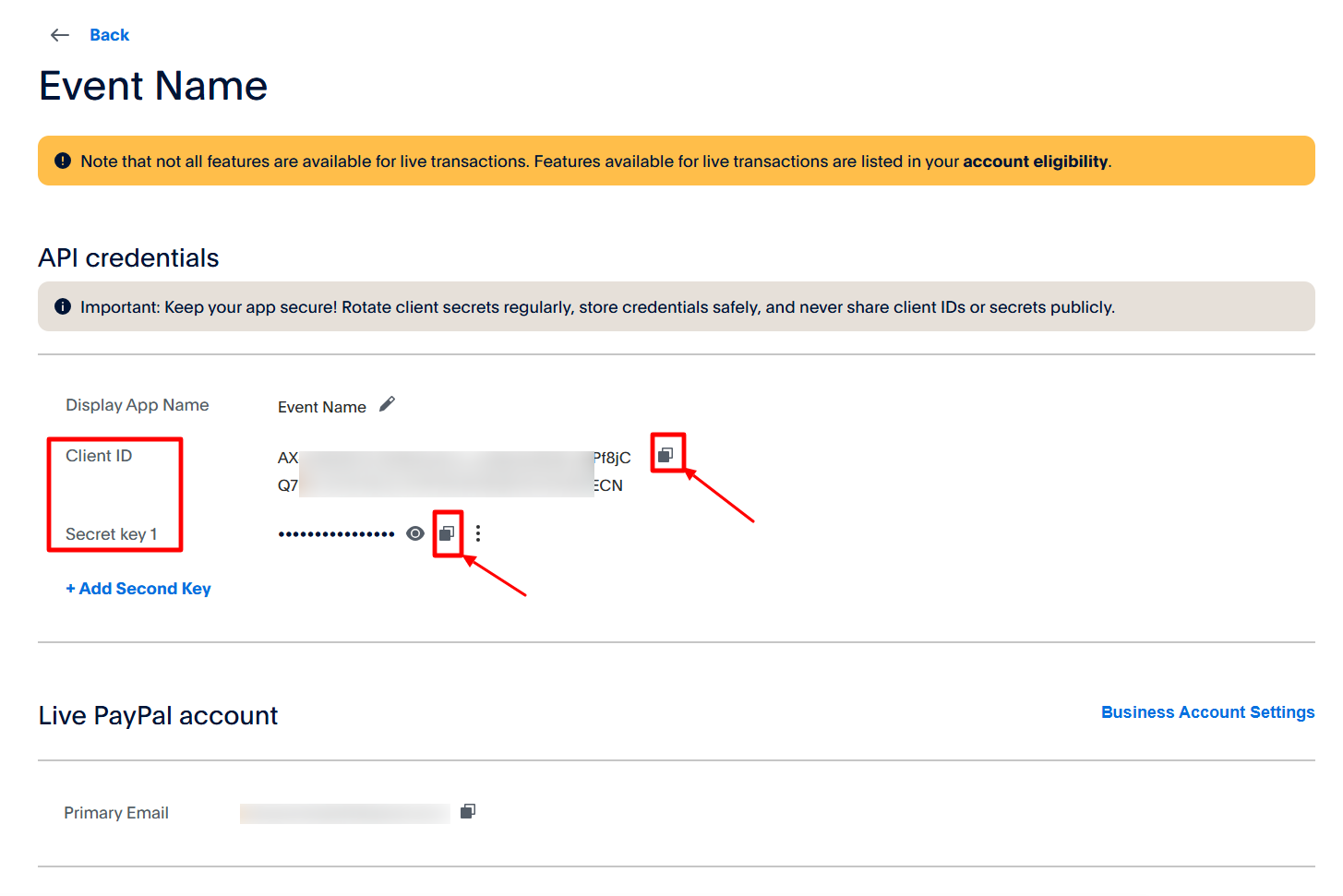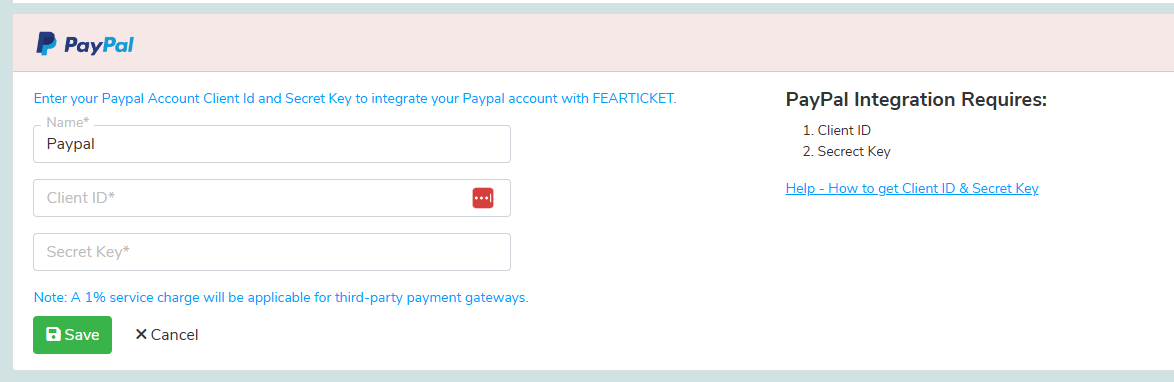 Copy "Client ID" from here to place this client ID on the Paypal setup page on the FEARTICKET Account. Similarly, copy "Secret Key" to place it on the Paypal setup page on the FEARTICKET Account.