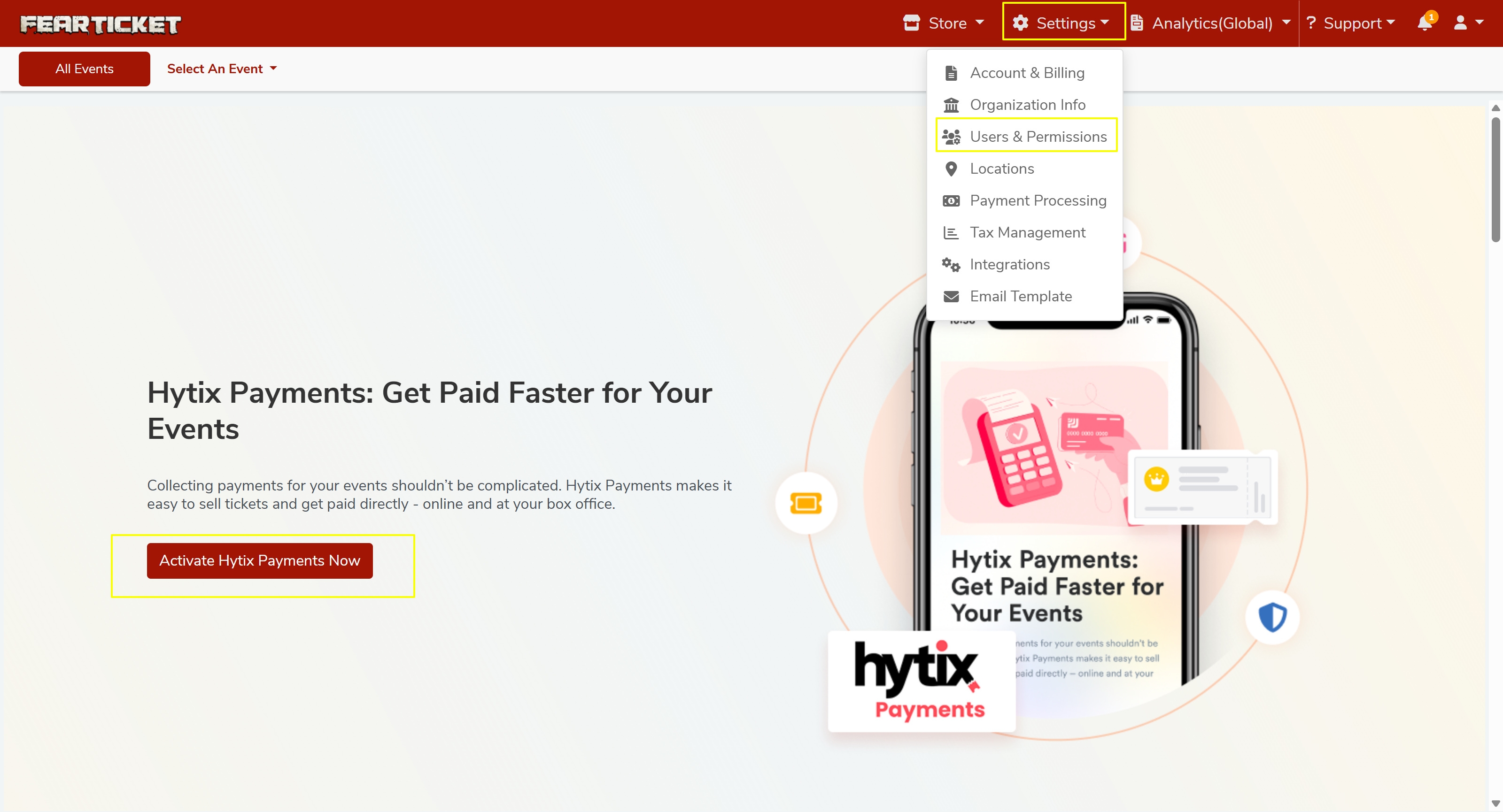 The easiest way to get started is by activating Hytix Payments — our built-in payment solution. Click Activate Hytix Payments Now on the Payment Processing screen.