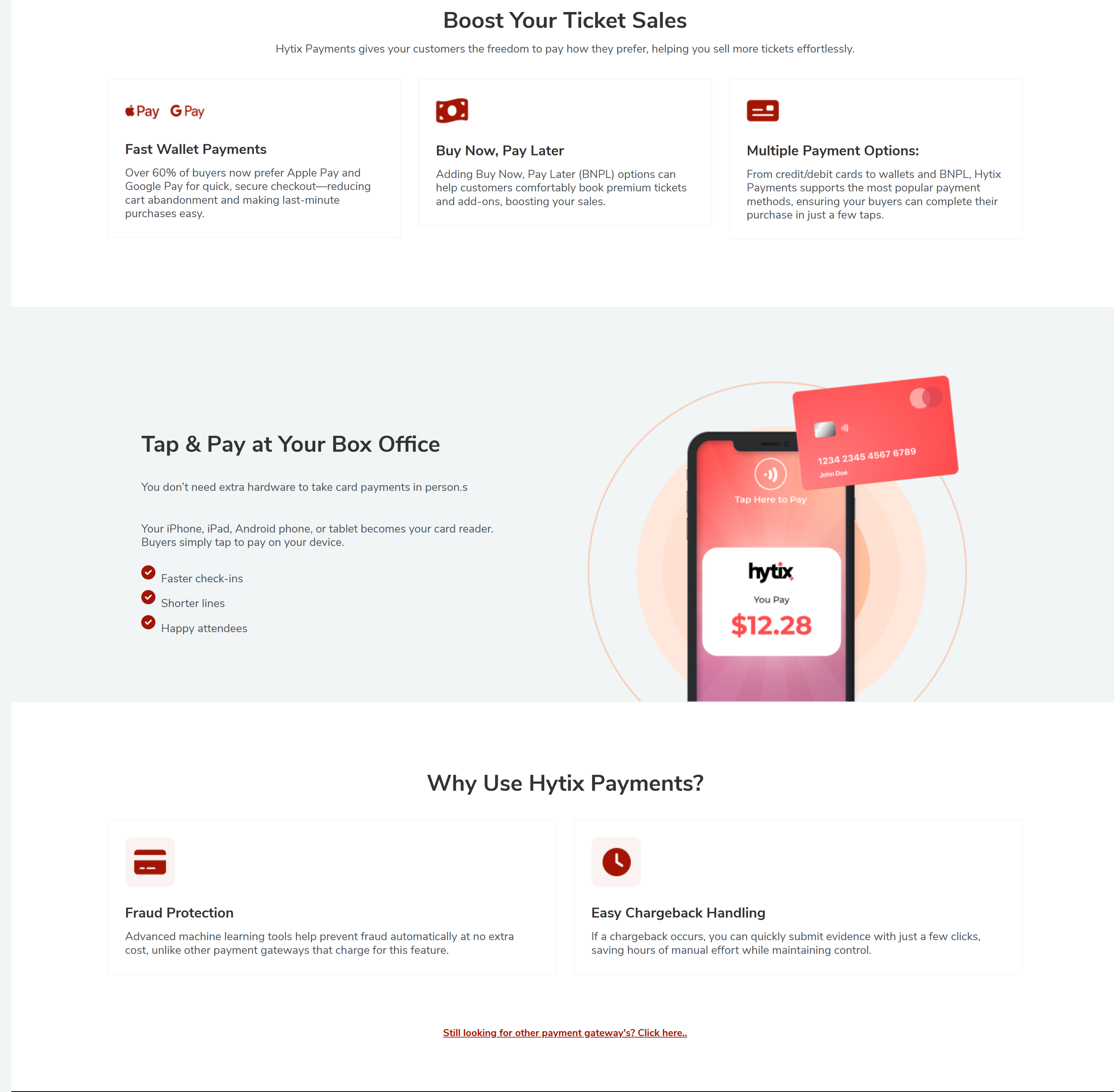 Hytix Payments supports multiple payment options to help you sell more tickets: