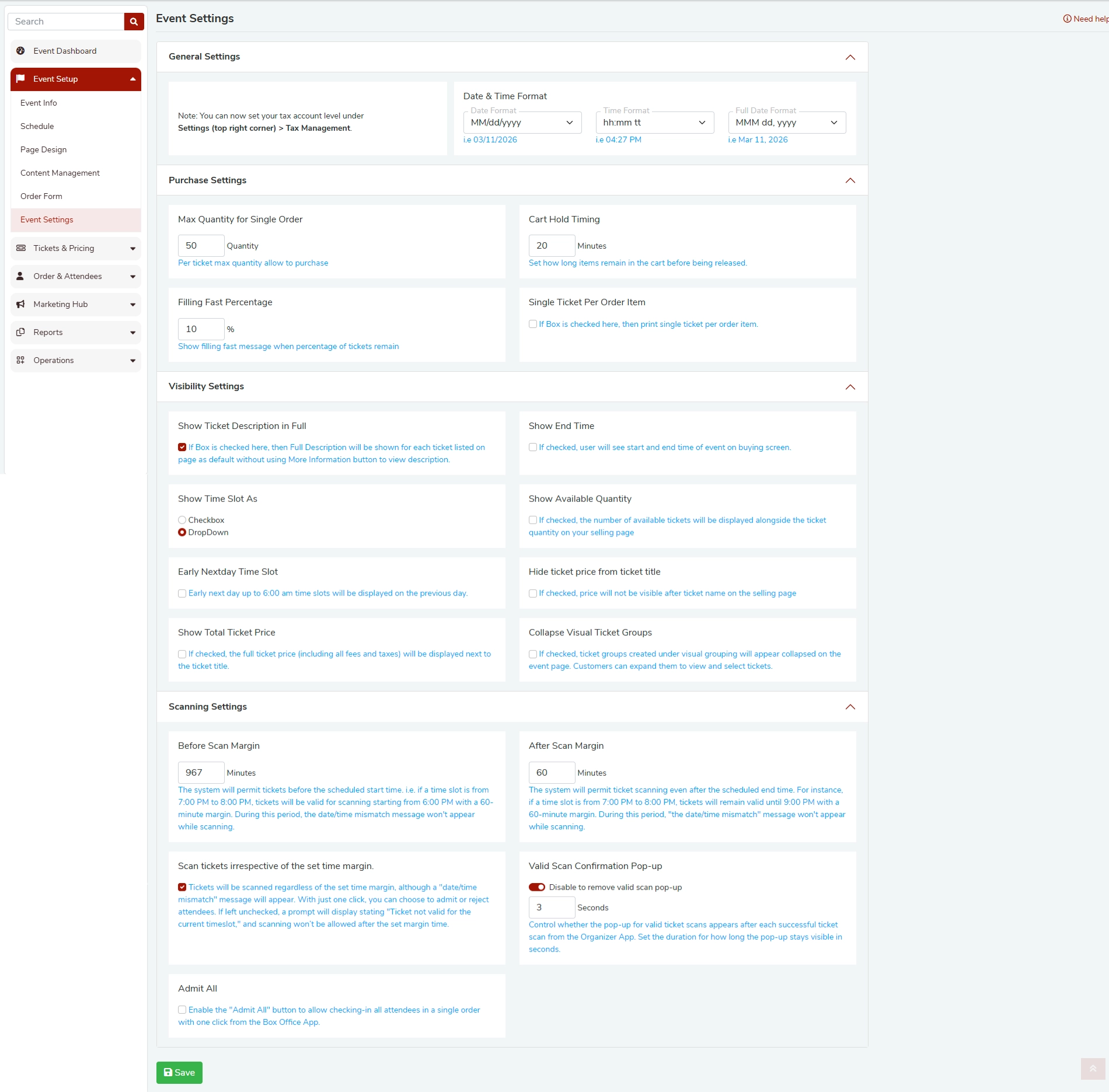 The Event Settings page allows event organizers to configure how their event behaves, from purchase rules and ticket visibility to scanning policies. Below are answers to the most common questions.