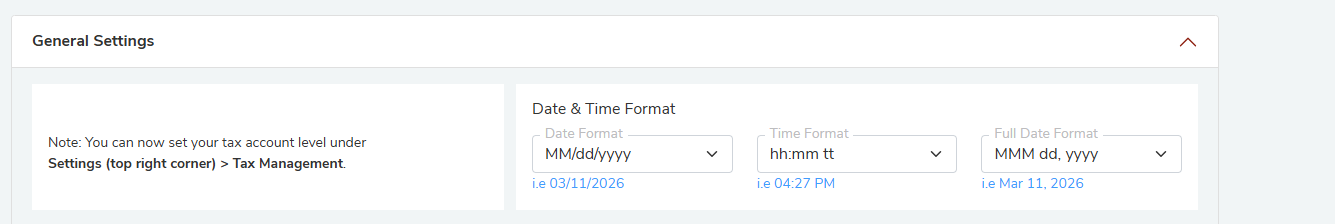 Note: Tax account level settings are managed separately under Settings (top right corner) > Tax Management.