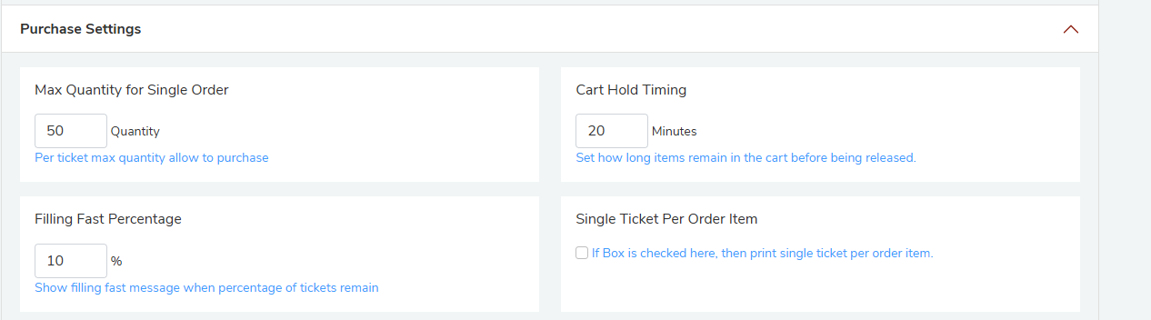 When remaining ticket inventory drops to or below the percentage you set, a "Filling Fast" message will appear on the event page to create urgency. The default is 10%.