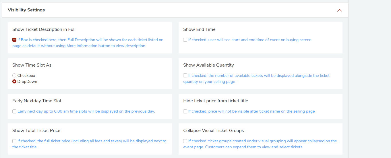 Visual Ticket Groups let you group tickets together visually on your event page. When Collapse Visual Ticket Groups is enabled, these groups appear collapsed by default. Customers can expand them to view and select tickets.