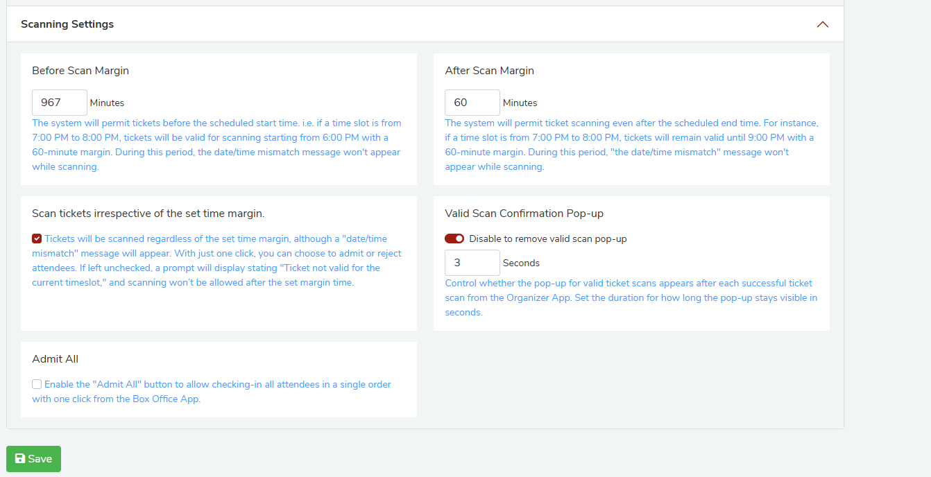 When enabled, tickets can be scanned at any time regardless of the set margins. However, a date/time mismatch message will still appear, giving the scanner the option to admit or reject the attendee. If this option is disabled, scanning outside the margin will display "Ticket not valid for the current timeslot" and scanning will be blocked.