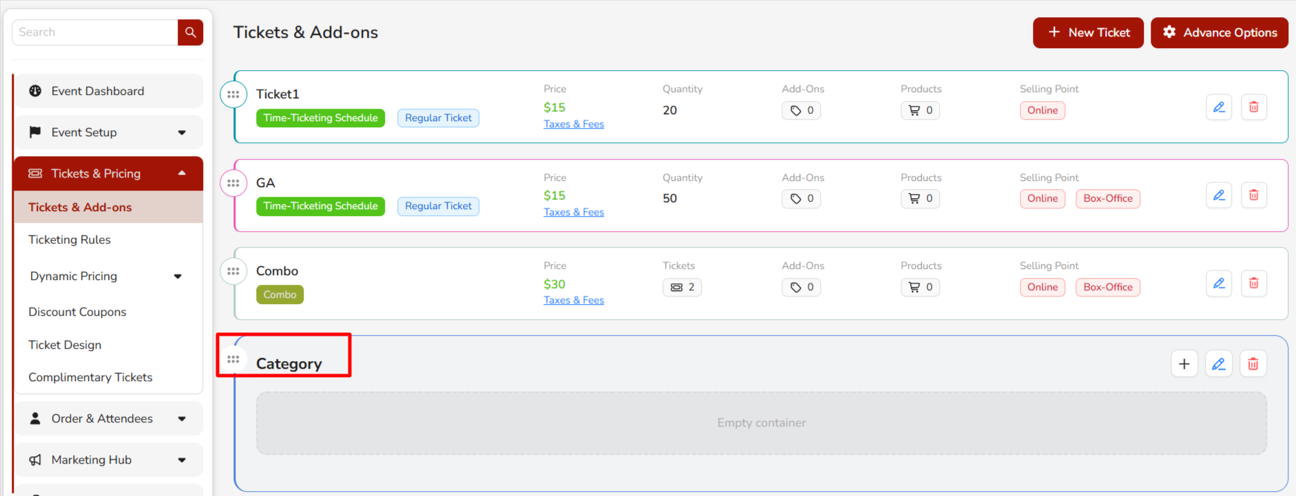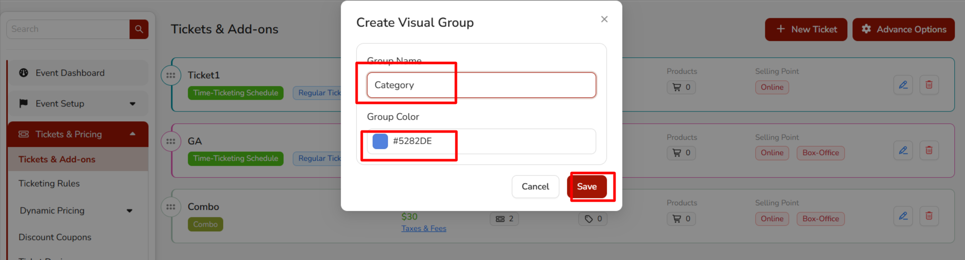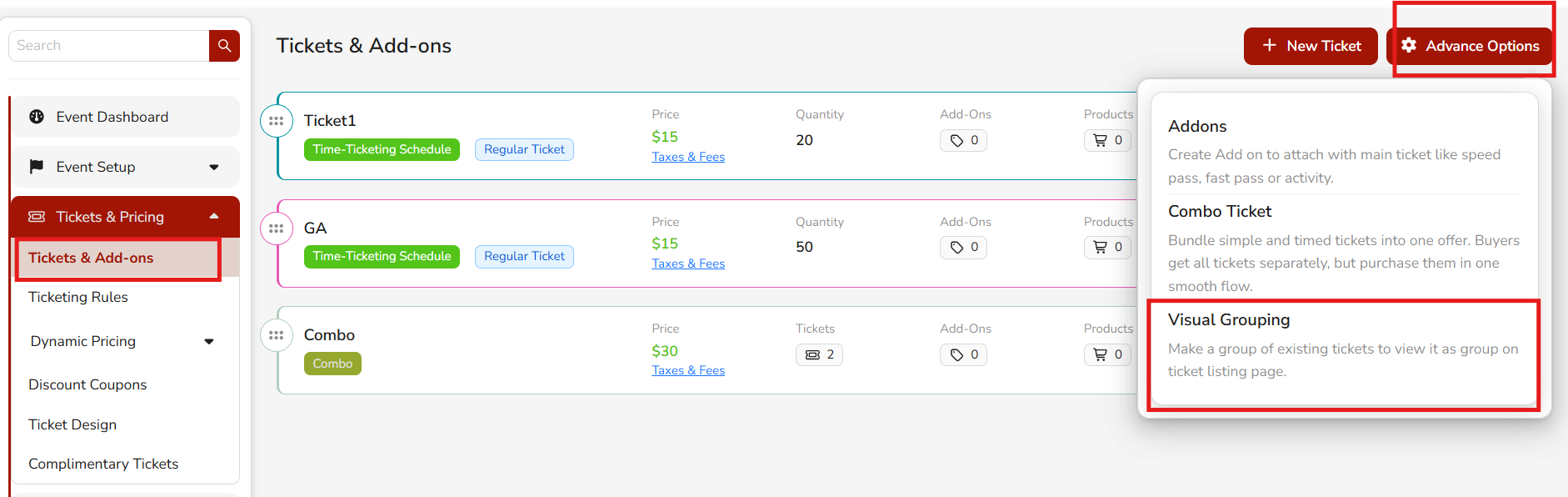 Go to Tickets & Pricing → Tickets & Add-ons, then click Advance Options and select Visual Grouping.