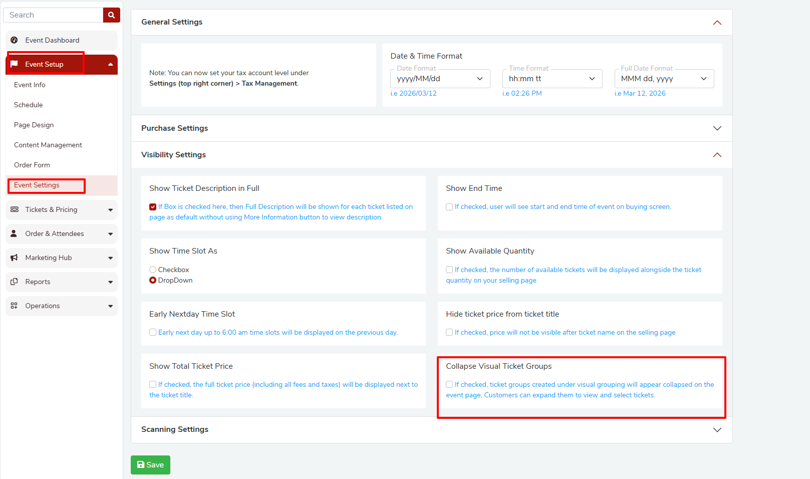 - Navigate to Event Settings > Visibility Settings > Collapse Visual Ticket Groups.