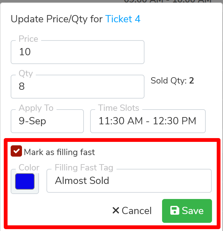 - Mark as filling fast: If you check this box, the option will open to let you change the tag content as well as the color of the tag for that timeslot. It will be shown as whatever tag you mentioned, on your ticketing page for select combination of date and timeslot.