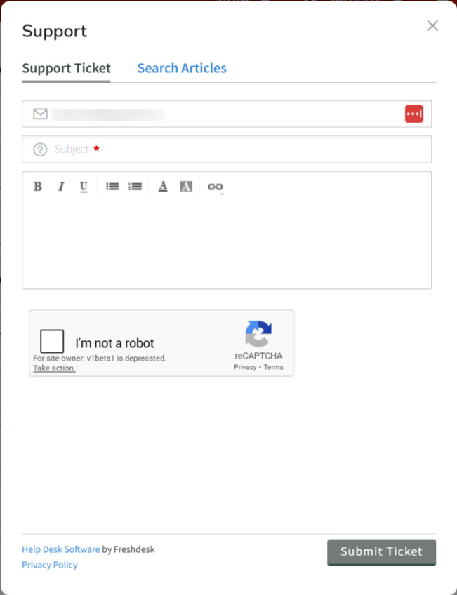 Before submitting the ticket, verify the “I’m not a robot” checkbox for security. Once completed, click Submit Ticket. Our support team will review your request and respond to the registered email address.