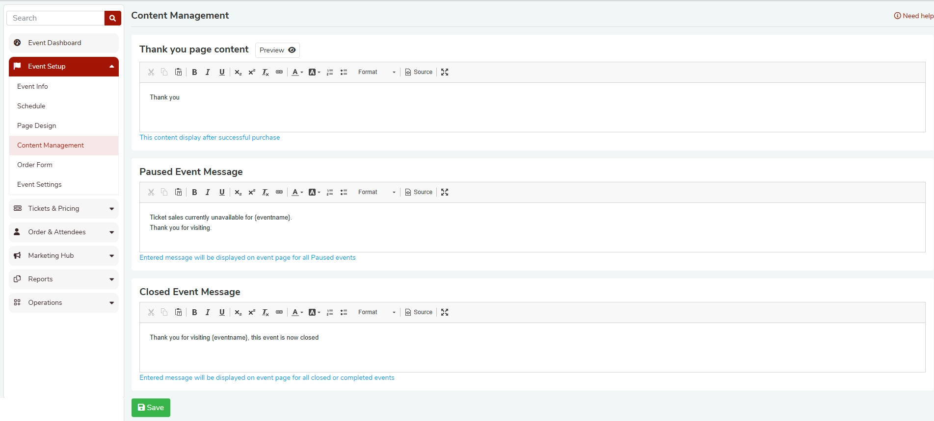 The Content Management section (found under Event Setup) allows event organizers to customize the messaging attendees see at key touchpoints — after a purchase, when an event is paused, and when an event is closed or completed.