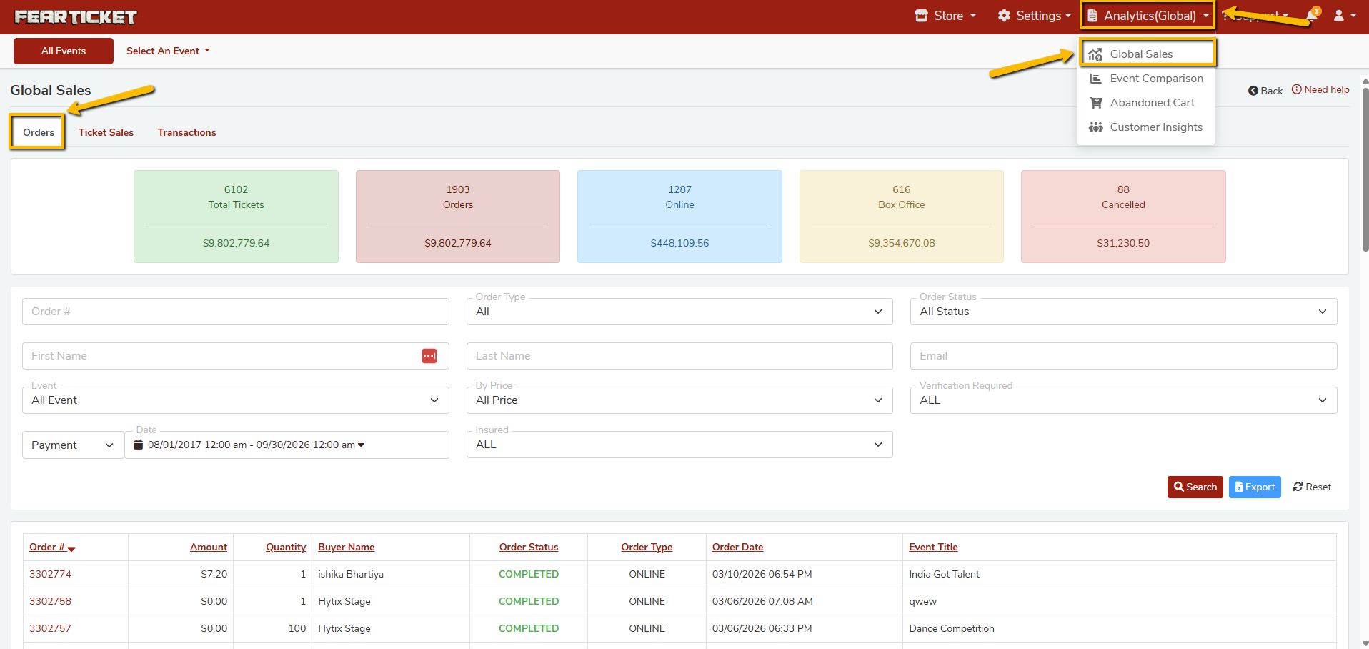 Global Sales is your command center for tracking all ticket revenue and order activity across every event in your FEARTICKET account. Navigate to Analytics (Global) > Global Sales from the top navigation bar to access this section.