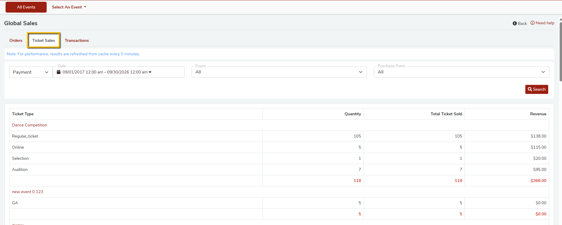 - Refresh after 5 minutes if you are monitoring live sales during an event night.