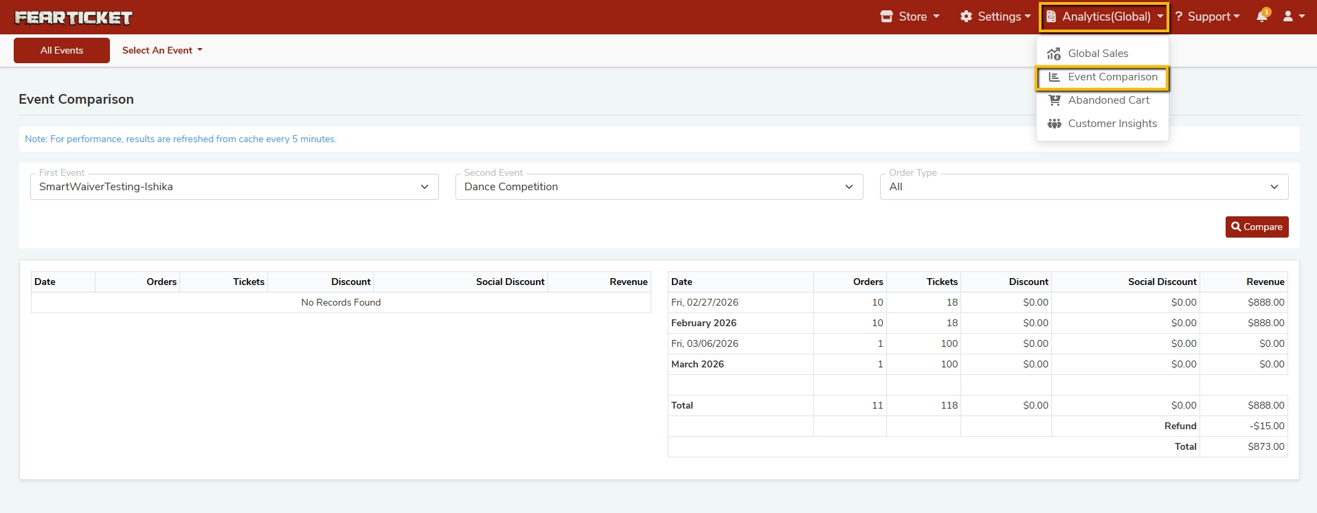 Event Comparison is available to event organizers with access to the Analytics (Global) section of their FEARTICKET account. If you do not see this option, contact FEARTICKET support to verify your account permissions.