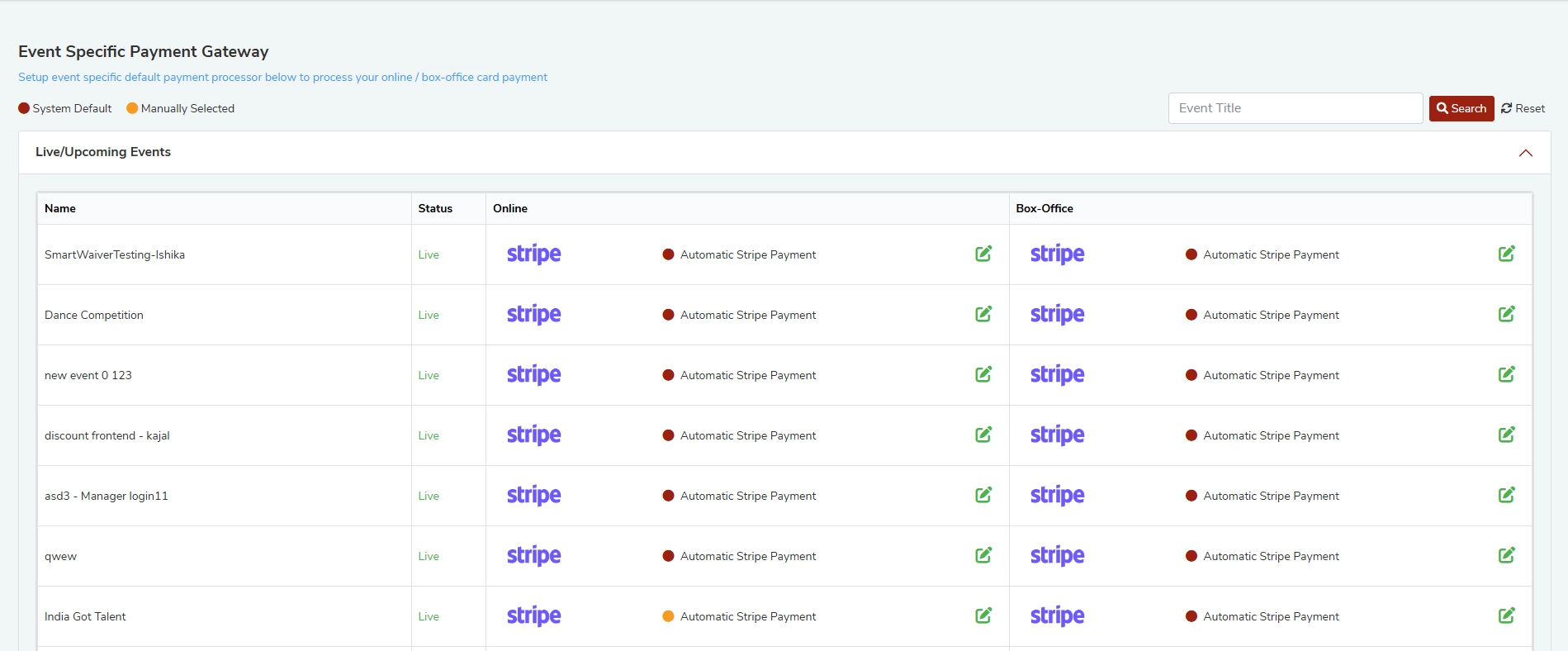 Yes. Use the Event Title search bar at the top-right of the Event Specific Payment Gateway section and click Search to filter events by name. Click Reset to clear the filter and view all events.