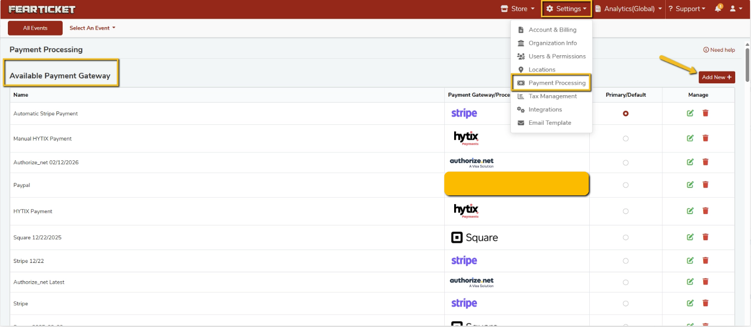 If no event-specific gateway is configured, FEARTICKET will automatically use the system default (Primary) gateway for both online and box-office transactions for that event. These events are marked with a red dot.