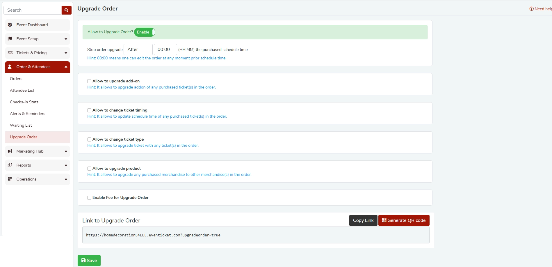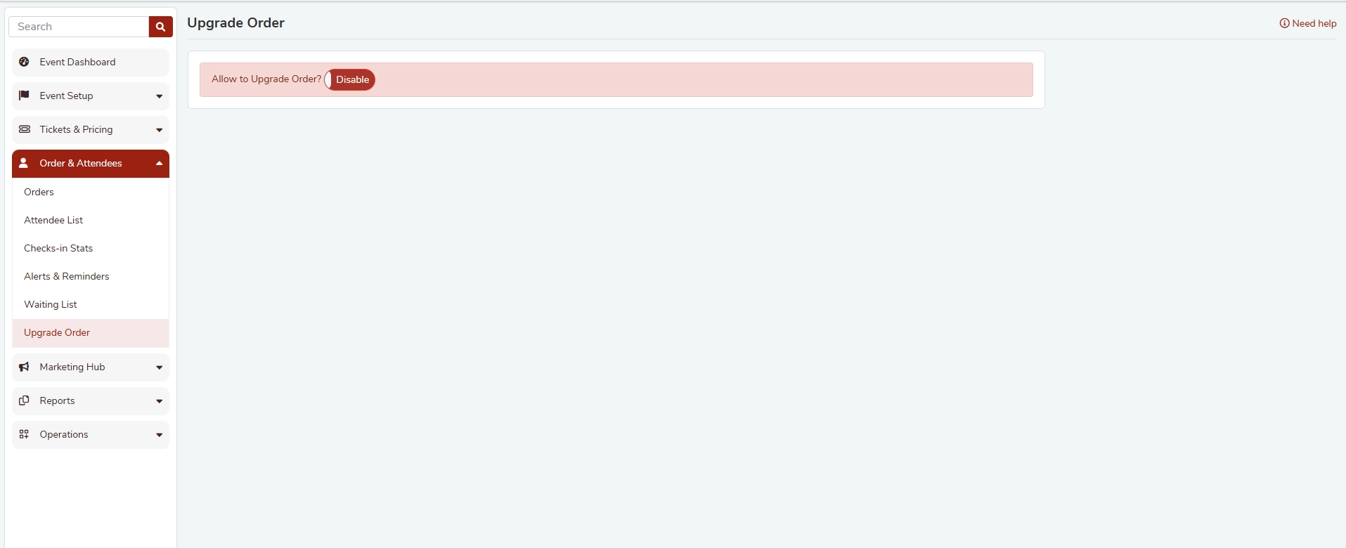 When the toggle is set to Disable, attendees will not be able to modify or upgrade their orders. The settings panel will be hidden, and no upgrade link will be active.