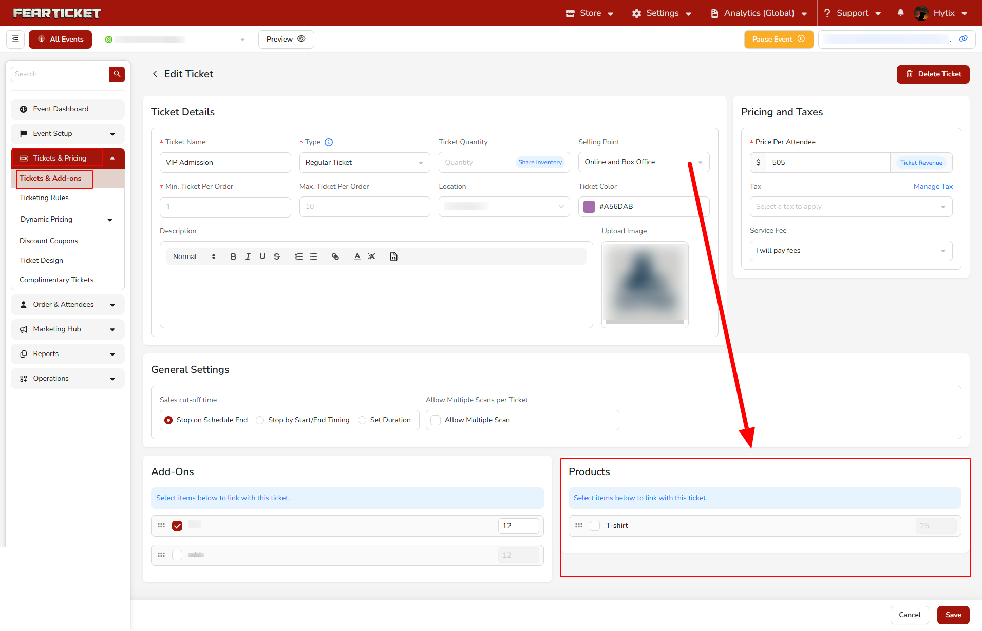 Scroll down to the Products section inside the ticket settings.Select the product(s) you want to link with that ticket..