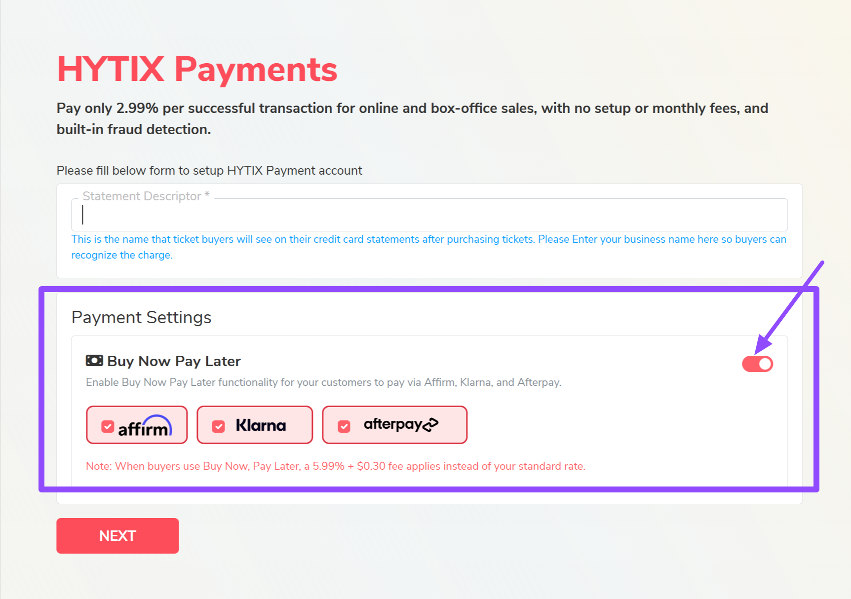 You will see a screen asking for your statement descriptor: This is the name buyers will see on their credit card statements (usually your event or business name for clear recognition). - Under Payment Settings, enable the “Buy Now Pay Later” toggle.