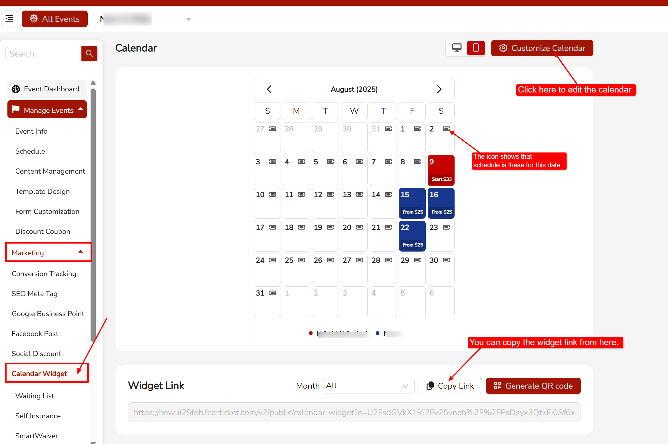 - In your organizer dashboard, go to Manage Events → Marketing → Calendar Widget.
