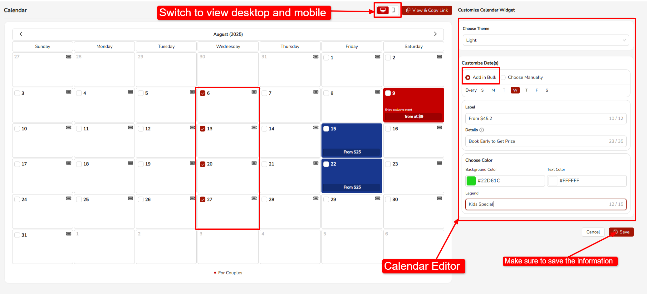 - Colors: Change date backgrounds from “Choose Color” box to match your brand palette.