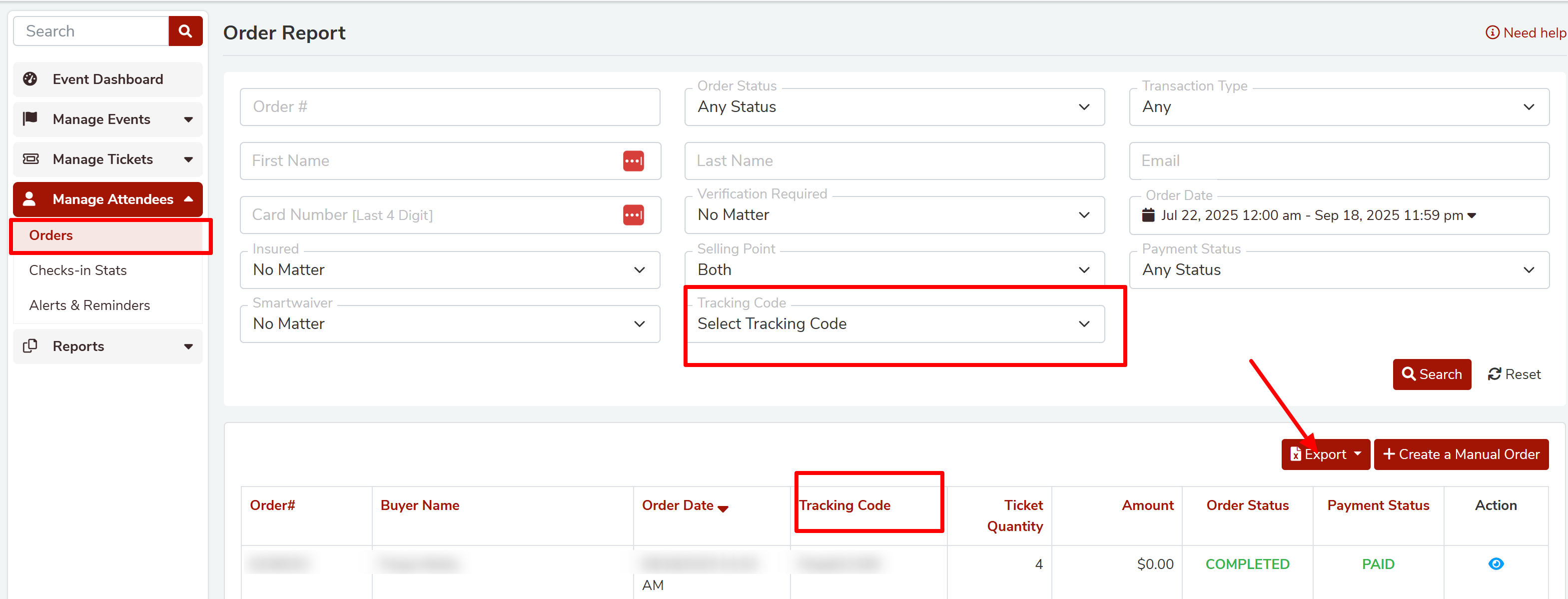 - Use the Tracking Code filter on the Order Report page (Manage Attendees > Orders) to refine results.
