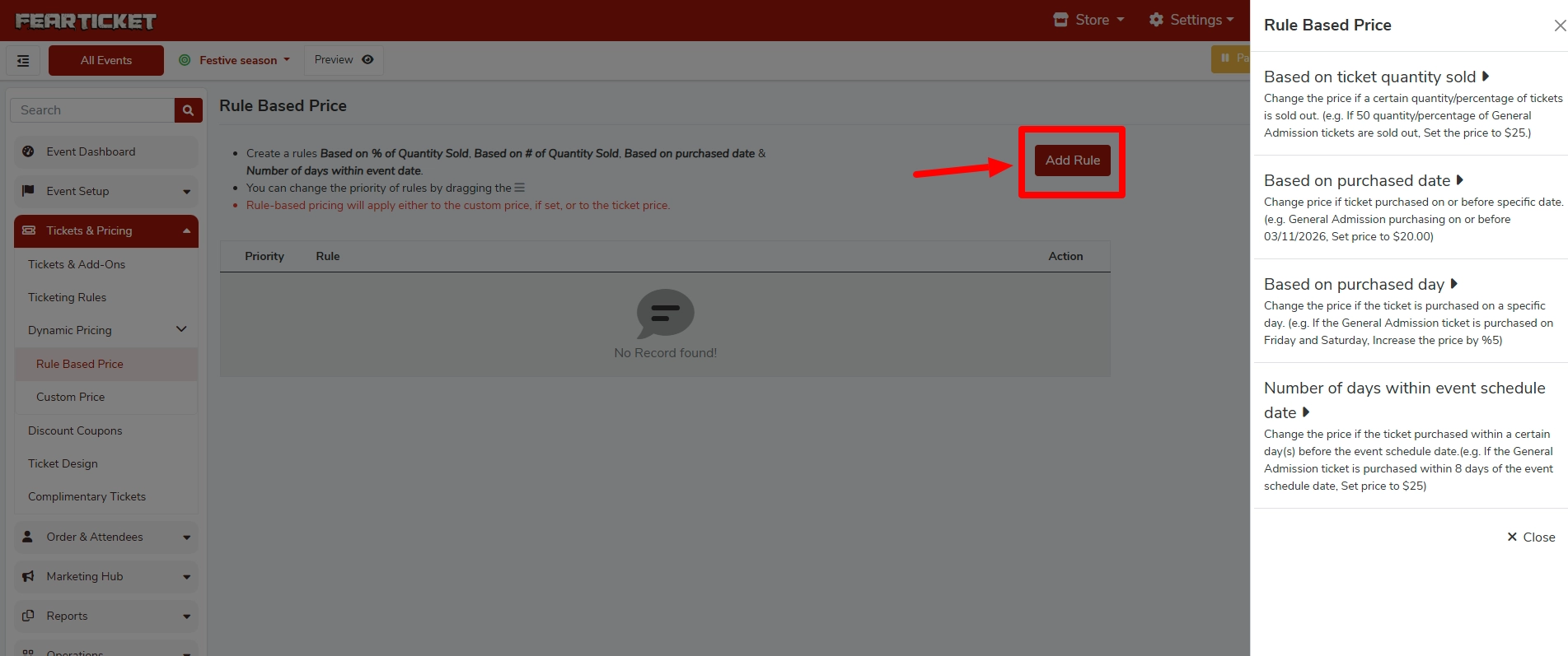 Rule Based Price is a powerful dynamic pricing tool in FEARTICKET that allows event organizers to automatically adjust ticket prices based on predefined conditions. This feature is located under Tickets & Pricing > Rule Based Price in your Event Setup panel.
