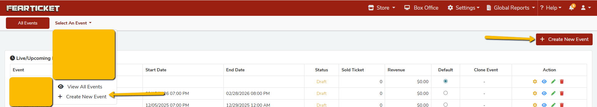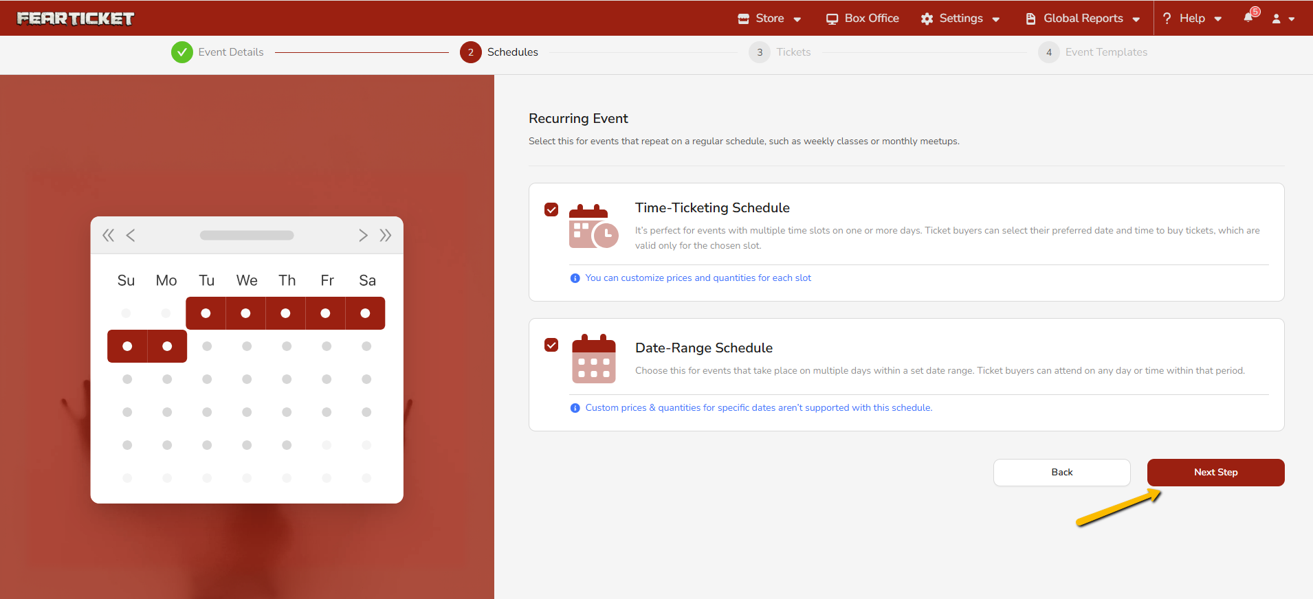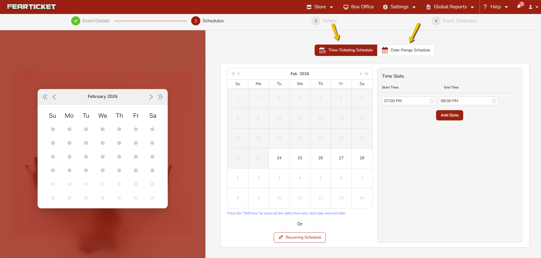 FEARTICKET offers two schedule types under the Recurring Event section: