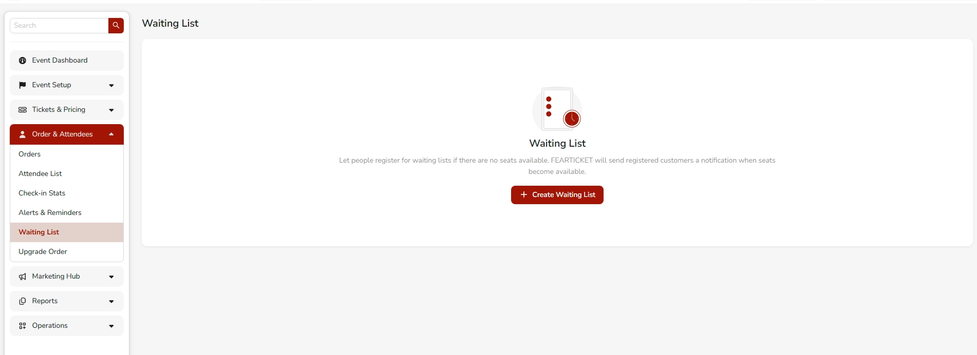 The Waiting List feature in FEARTICKET allows potential attendees to register their interest in a ticket even when no seats are currently available. When a spot opens up, FEARTICKET automatically sends a notification email to registered customers, giving them the opportunity to complete their booking.