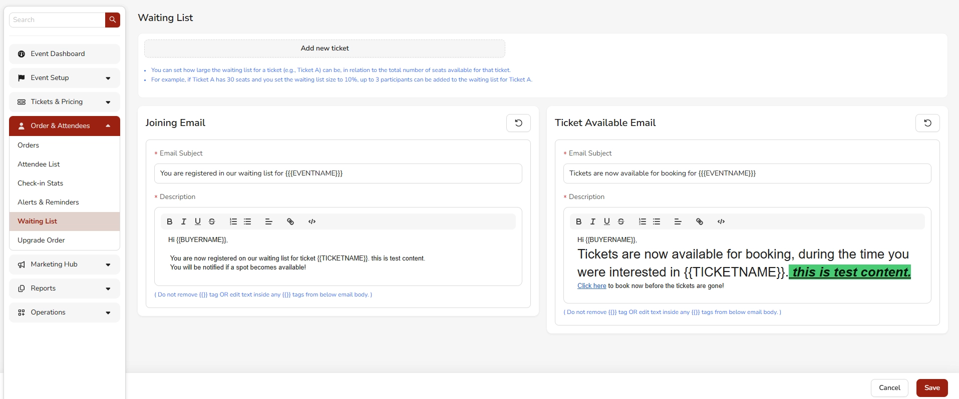 - Configure the waiting list size (as a percentage of total ticket capacity)