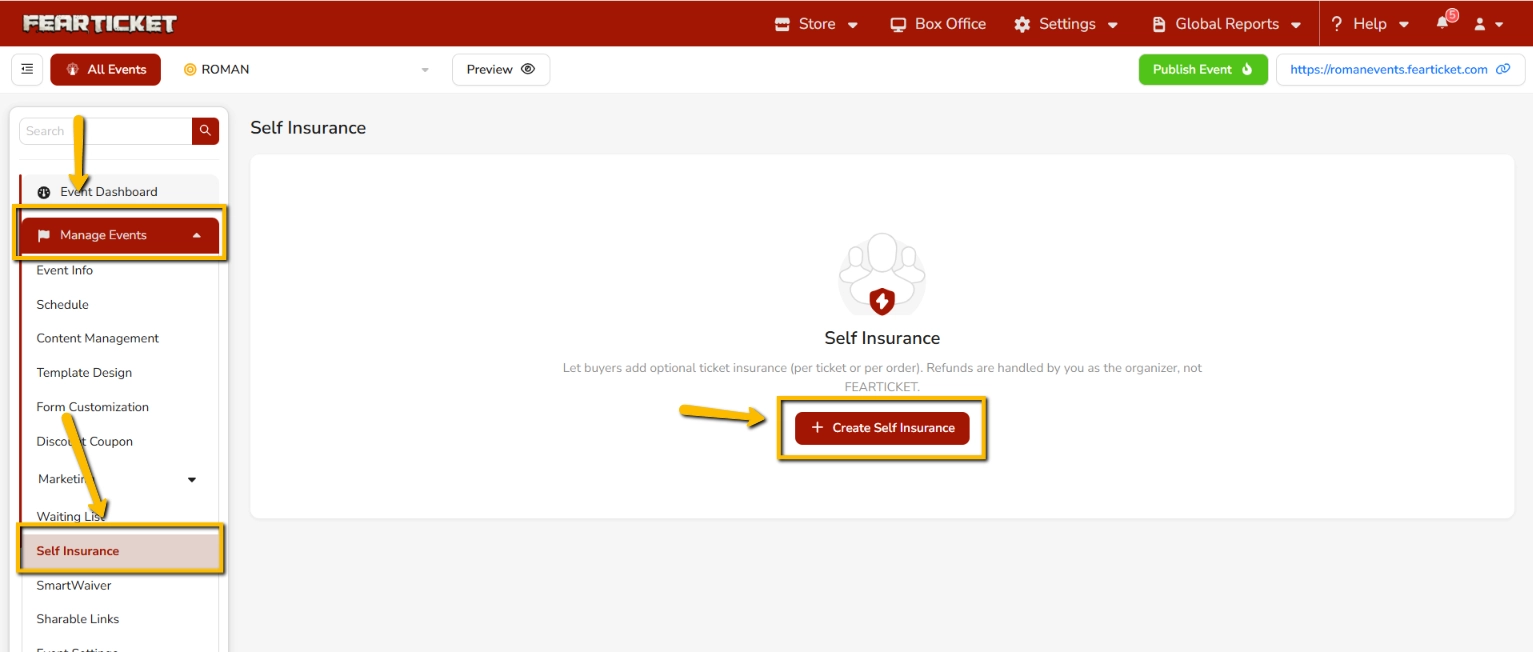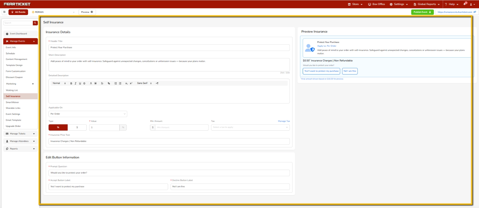 Self Insurance is a feature in FEARTICKET that allows event organizers to offer optional ticket insurance to buyers at the time of purchase. Refunds for insured tickets are handled by you as the organizer, not by FEARTICKET.