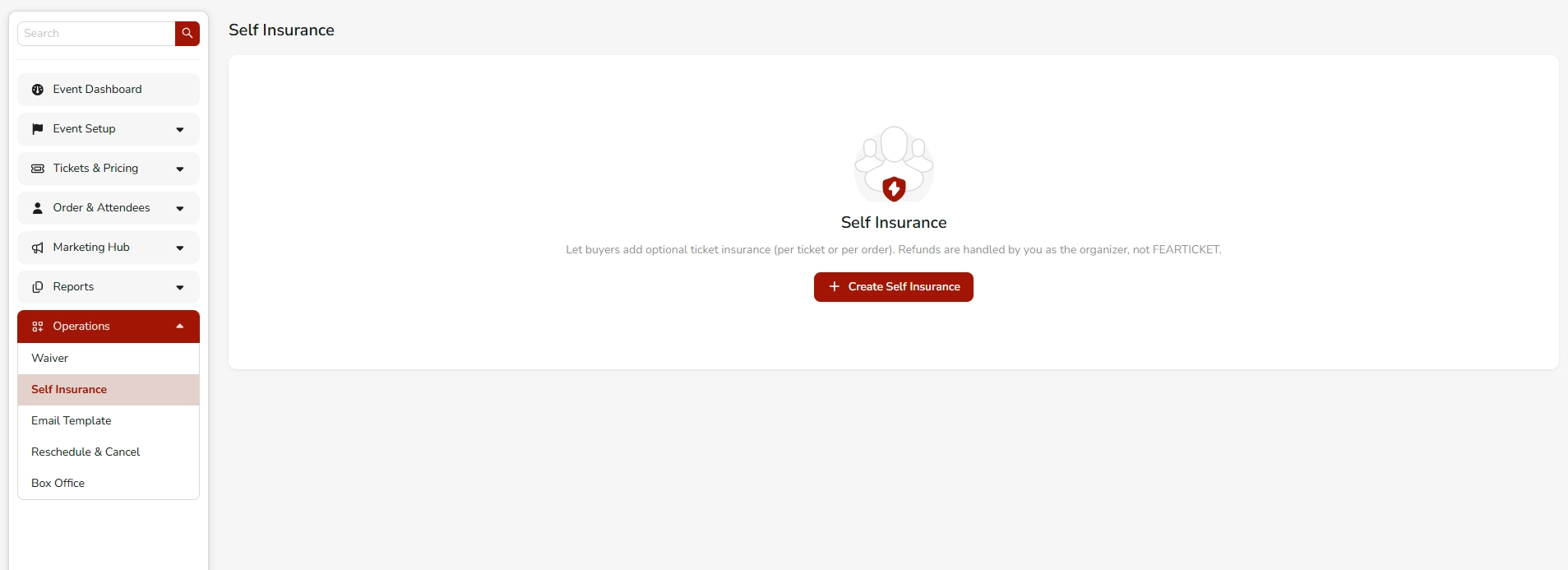 A: Go to your Event Dashboard - Operations - Self Insurance. If no insurance has been created yet, you'll see an empty state with a + Create Self Insurance button.