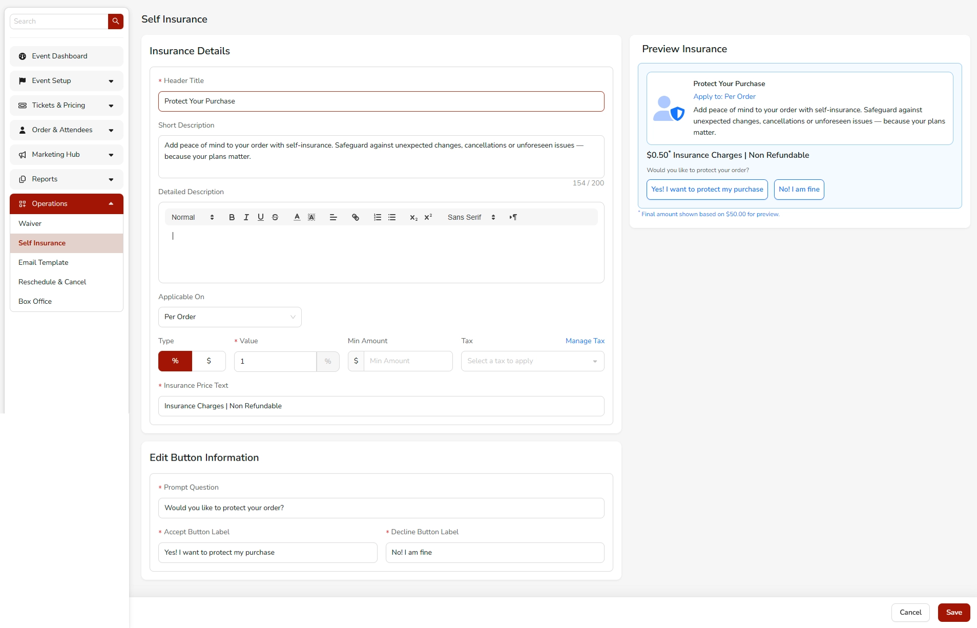 A: You can create a Self Insurance configuration per event. Navigate to Operations - Self Insurance and click + Create Self Insurance to get started.