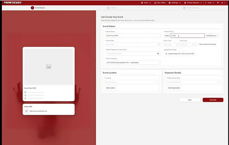 When you start creating a new event, you'll land on the Event Details page. The left side of the screen shows a live preview card of how your event will appear to buyers. Fill in the fields on the right and your preview updates in real time.