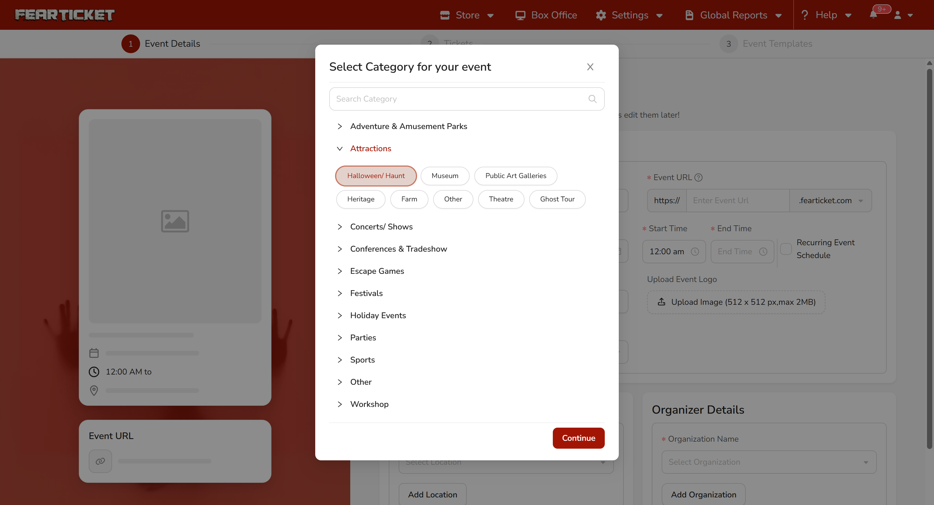 Tip: Selecting the right category improves how your event is discovered on the platform. For haunted attractions, select Holiday Events or Attractions.