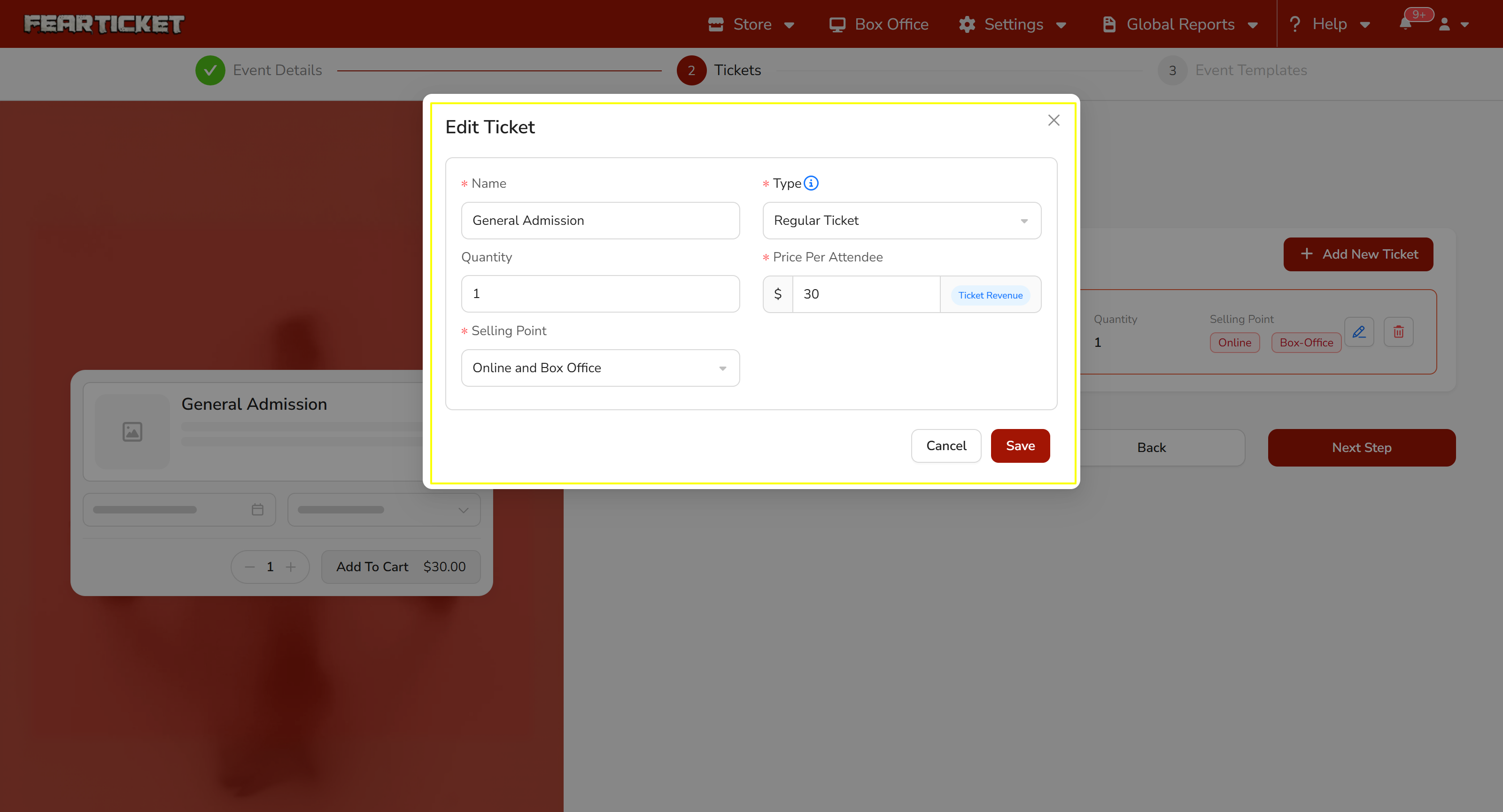 On the Create Tickets page, you'll see a "New Ticket" form on the right and a buyer-facing preview on the left. As you save each ticket, it appears on the page. You can add as many ticket types as needed using the Add New Ticket button.