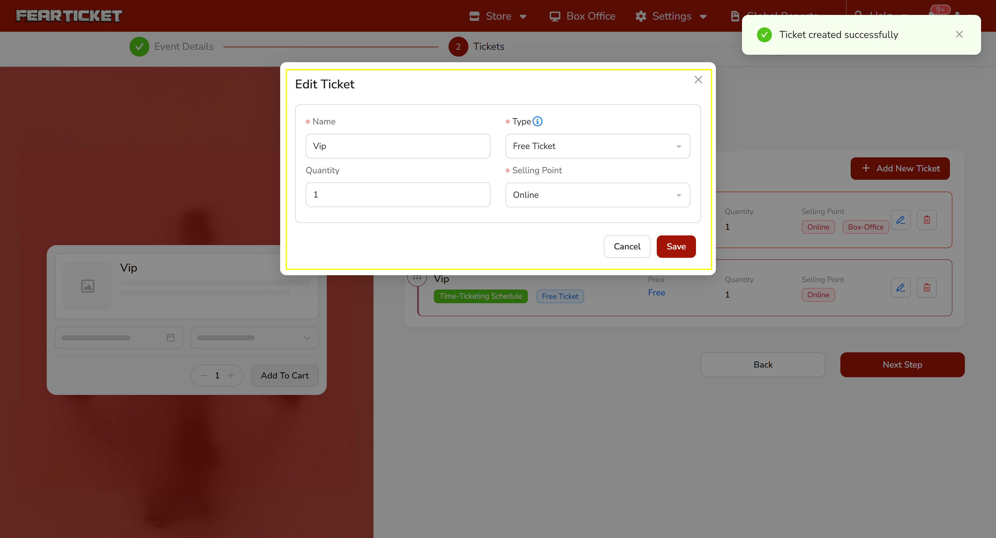 Select Free Ticket from the Type dropdown. The price field will disappear automatically since free tickets have no cost. Enter a name (e.g., "Free") and quantity, then click Save.