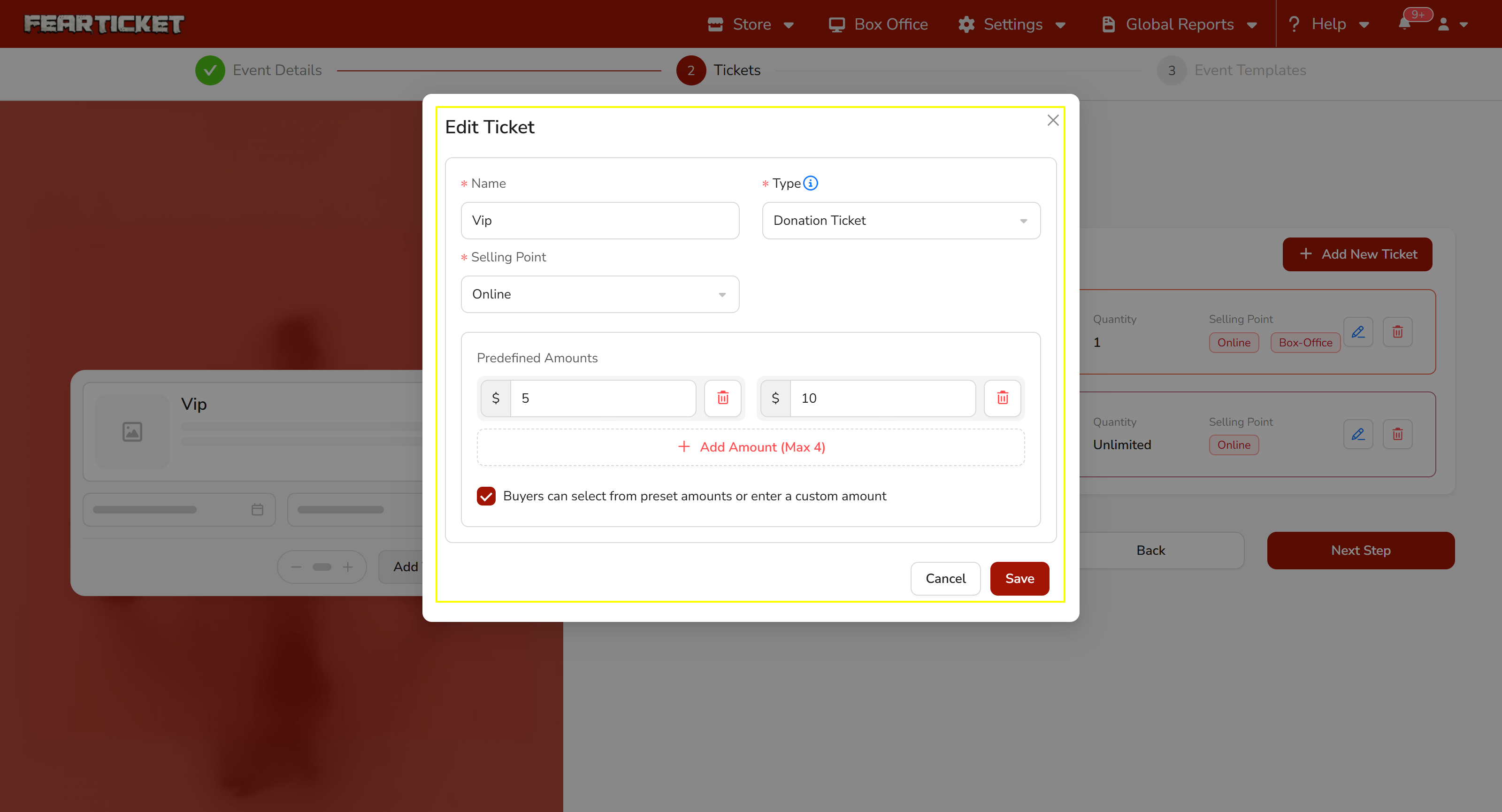 Select Donation Ticket from the Type dropdown. You'll see a Predefined Amounts section appear where you can enter suggested donation values (e.g., $5, $10). Buyers can choose from these amounts or enter their own custom amount. Click Save when done.