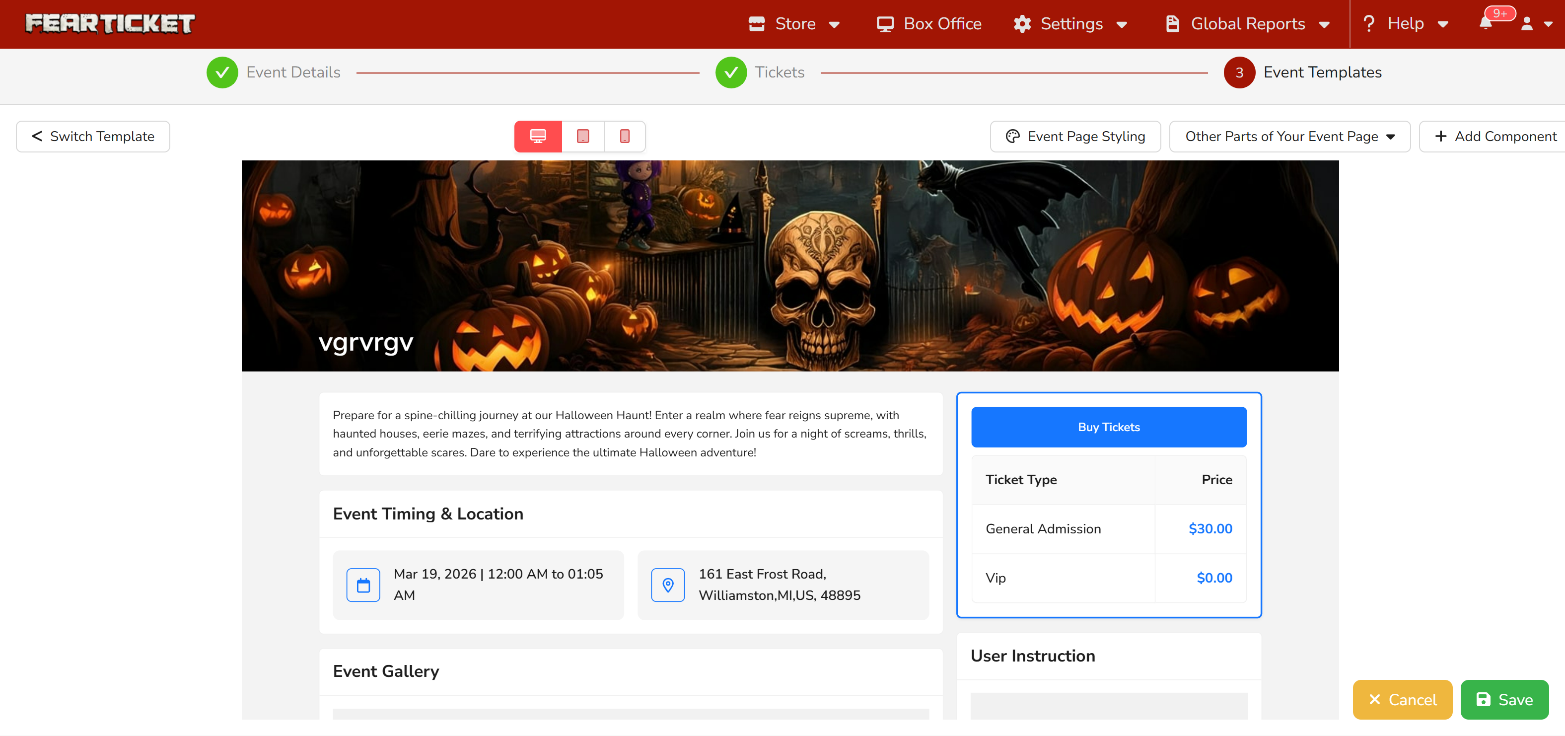Tip: Use high-quality landscape images for the gallery (1200px wide or larger works best). For haunted attractions and seasonal events, event atmosphere photos dramatically increase buyer confidence.