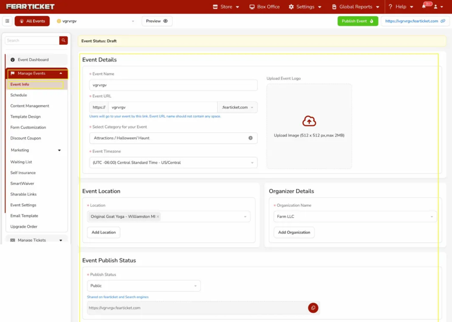 This is where you set the basic information for your event. Enter your Event Name, which is what attendees will see on the ticketing page. The Event URL is automatically generated from your event name and will be the link you share publicly (e.g., https://yourevent.fearticket.com). Select the Category that best describes your event (such as Attractions / Halloween / Haunt) and set the correct Event Timezone so your dates and times display accurately for your audience. You can also upload an Event Logo here, the image should be 512 x 512 px and no larger than 2MB.