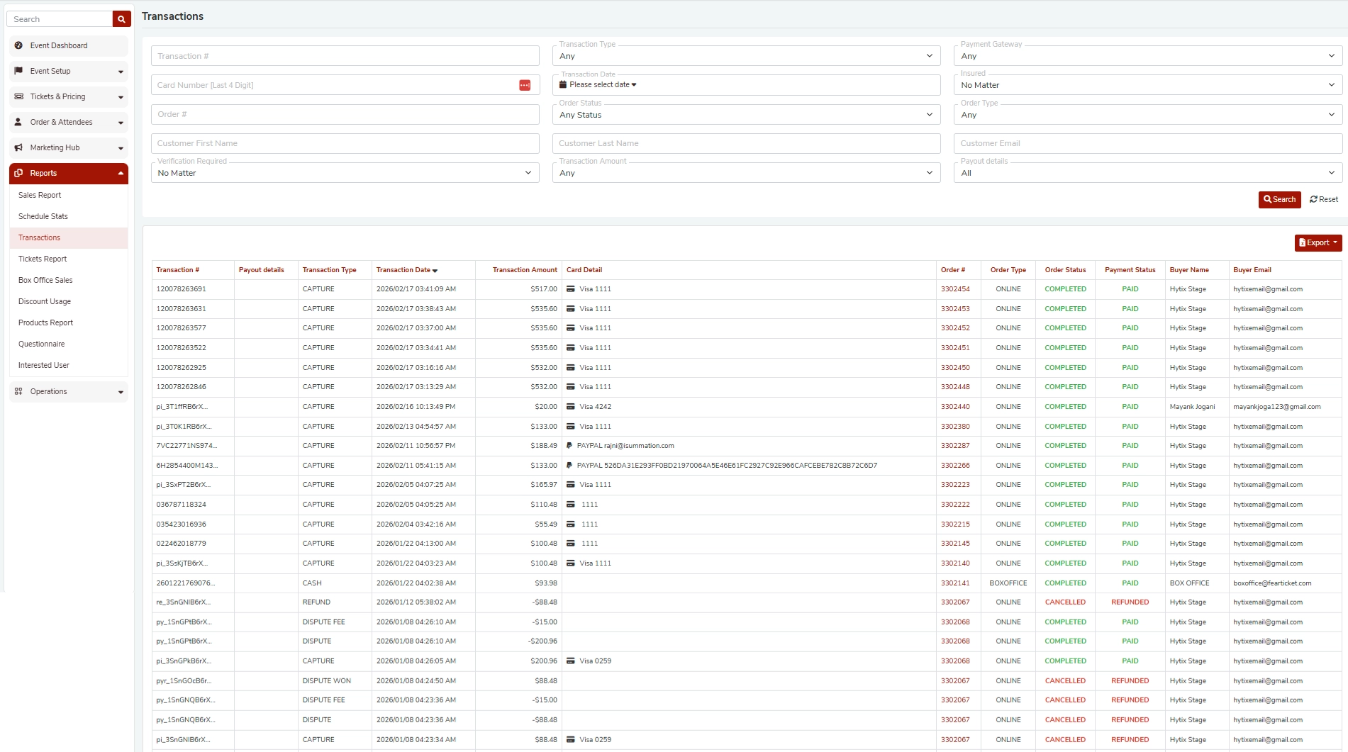 The Transactions Report shows a detailed list of payment activity for your event, including: