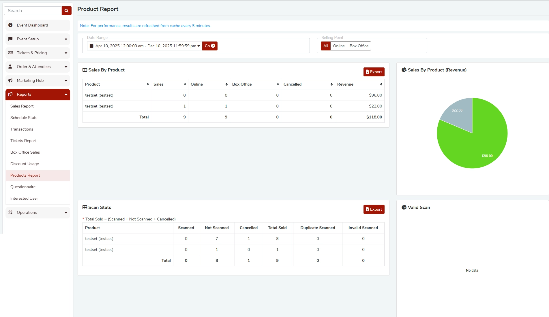 The Products Report helps event organizers understand how each ticket product is performing within a selected date range. It summarizes sales volume, revenue, selling channel, and scan/check-in activity in one place.