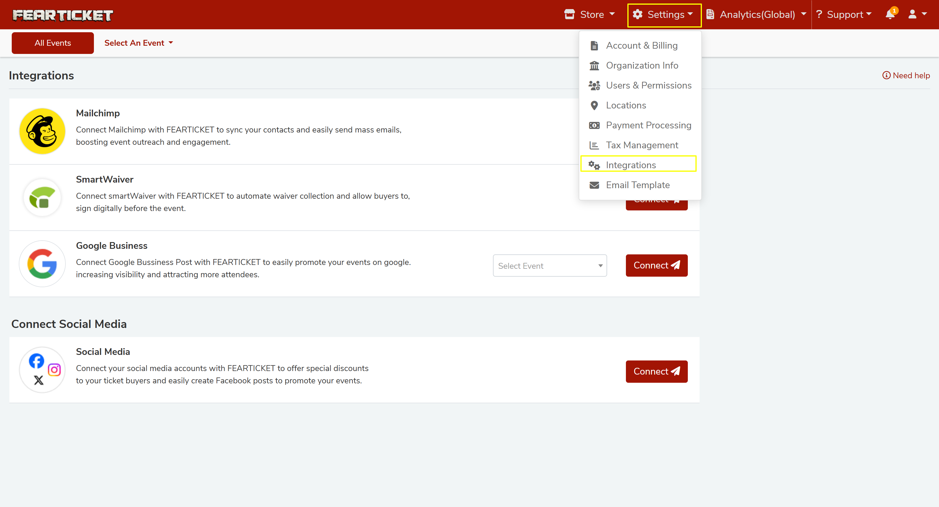 Connect third-party tools to your account to streamline email marketing, waiver collection, event promotion, and social media. To access integrations, click Settings in the top navigation bar, then select Integrations.