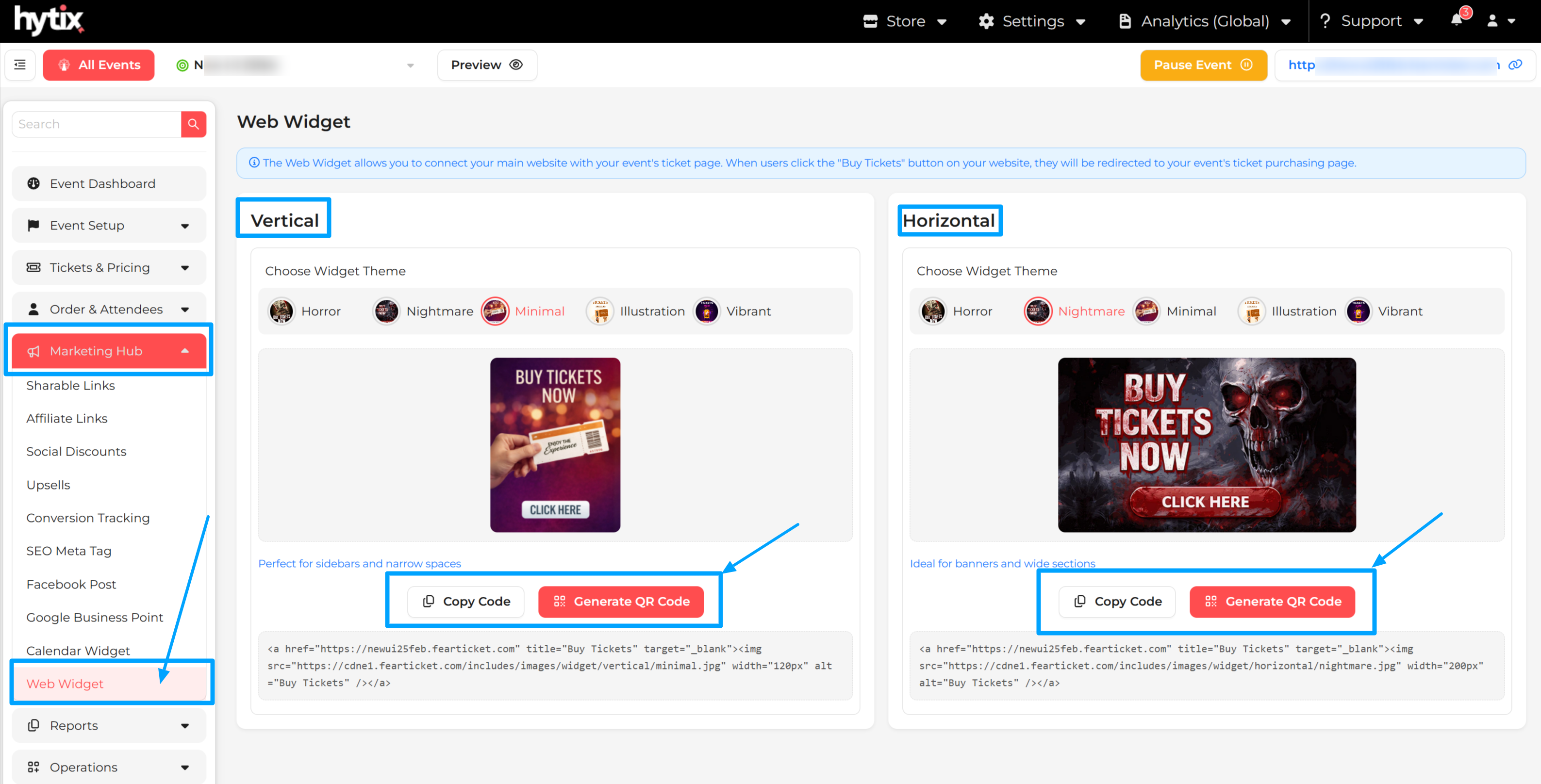 Web Widgets are ready-to-use “Buy Tickets” or “Book Your Experience” buttons that you can place on your own website. They act as a direct bridge between your website and your event’s ticketing page on Hytix/ FEARTICKET.